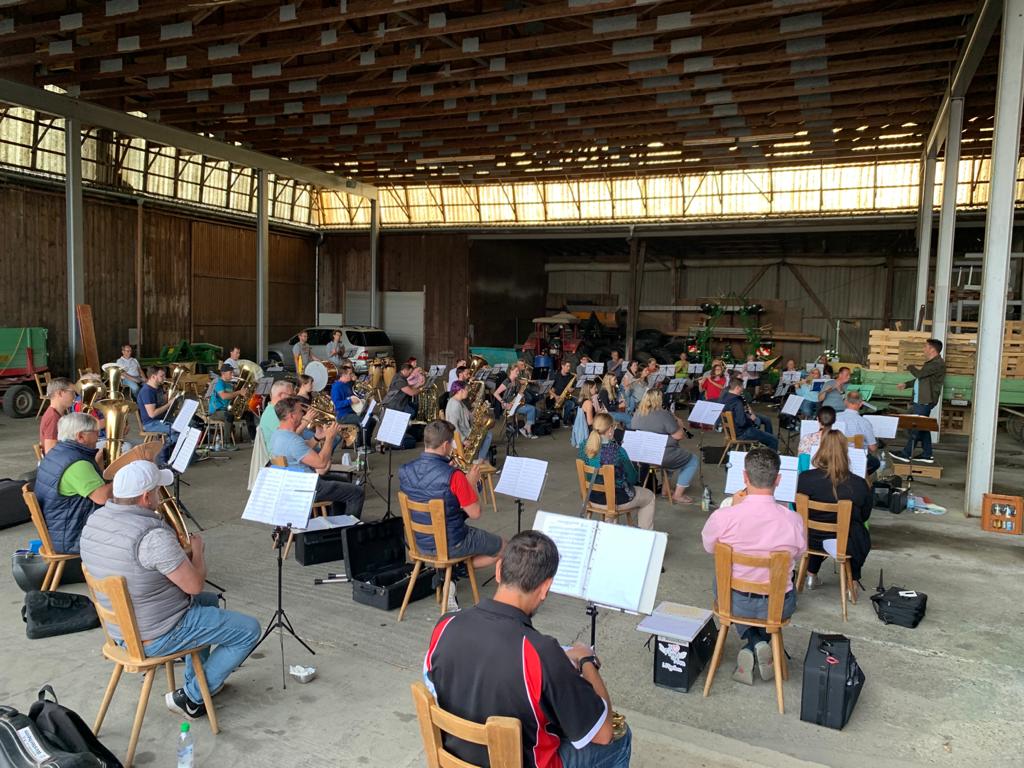 Unter strengsten Corona-Verordnungen und Richtlinien konnten wir wieder mit dem Probenbetrieb starten. Groß war die Freude bei Dirigent und allen Musikanten/innen. Wir bedanken uns bei Richard Rehm, der seinen Hof als „Probelokal“ zur Verfügung stellt und bei allen Nachbarn und Anwohnern, für ihr Verständnis. Musik geht ins Herz, stimmt die Seele glücklich und gemeinsam macht sie uns am meisten Spaß. Wir freuen uns auf weitere Gesamtproben.