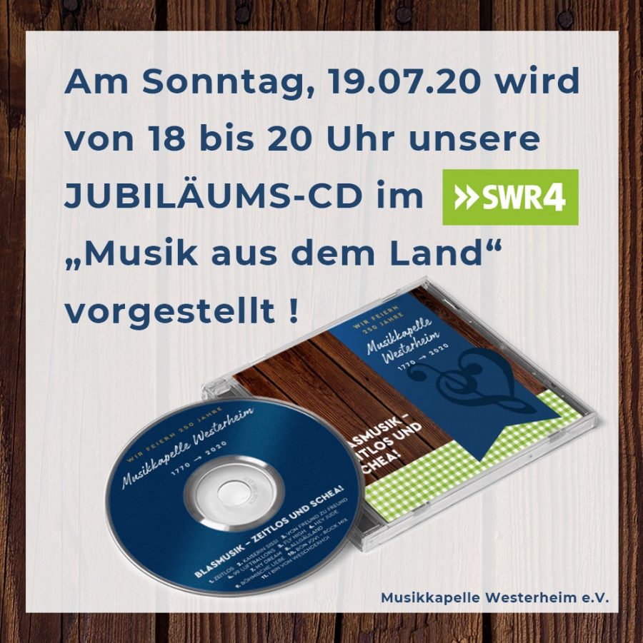 Einschalten lohnt sich! Am Sonntag, 19.07.2020 zwischen 18:00 Uhr und 20:00 Uhr stellt der SWR4 Baden-Württemberg unsere neue CD vor.In der Sendung “Musik aus dem Land” werden drei Stücke von der Musikkapelle Westerheim präsentiert, mit den Titeln:– I bin von Weschderhoi– Zeitlos– Hey JudeWer also Lust und Zeit hat, setzt sich vors Radio und genießt unsere Blasmusik.Und…