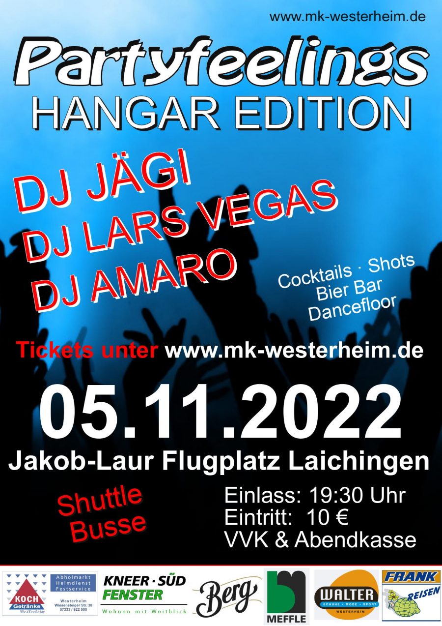 Endlich wieder Partyfeelings, endlich wieder feiern!! Am 05.11.2022 – dieses Mal im Hangar vom Jakob-Laur Flugplatz Laichingen. Alle Infos und Karten im Onlineverkauf hier: www.mk-westerheim.de/partyfeelings