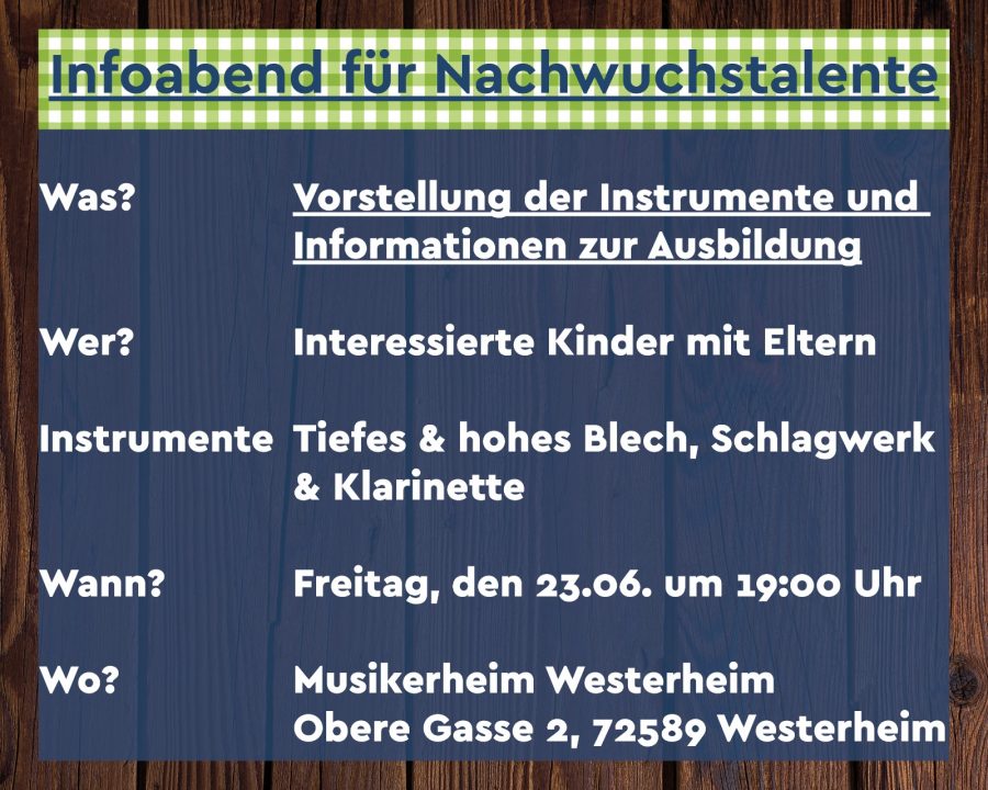 Am Freitag, den 23.06. haben interessierte Jugendliche um 19:00 wieder die Möglichkeit sich über die Vielfalt der Instrumente in einer Musikkapelle zu informieren. Es wird möglich sein, die verschiedenen Instrumente Probe zu spielen und fragen zu stellen. Darüber hinaus wird über den Ablauf des Unterrichts berichtet. Kommt einfach bei uns im Musikerheim vorbei. Eine Anmeldung…