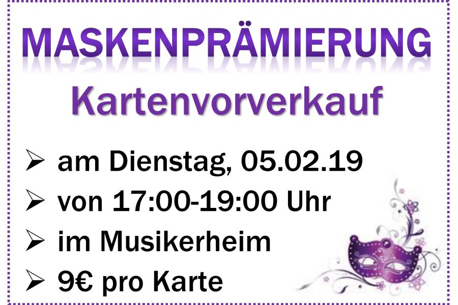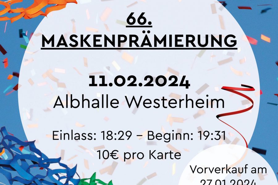 DetailsAuch in diesem Jahr freuen wir uns auf unsere Traditionsveranstaltung, die Maskenpämierung. Hierzu laden wir Sie recht herzlich ein. Unsere Maskenprämierung findet am 02.03.2025 ab 18:29 in der Albhalle statt. Tickets gibt es am Samstag, 15.01.2025 von 10:00 – 12:00 Uhr im Musikerheim für 10€ zu kaufen.. Wir freuen uns auf euch!!! Maske…