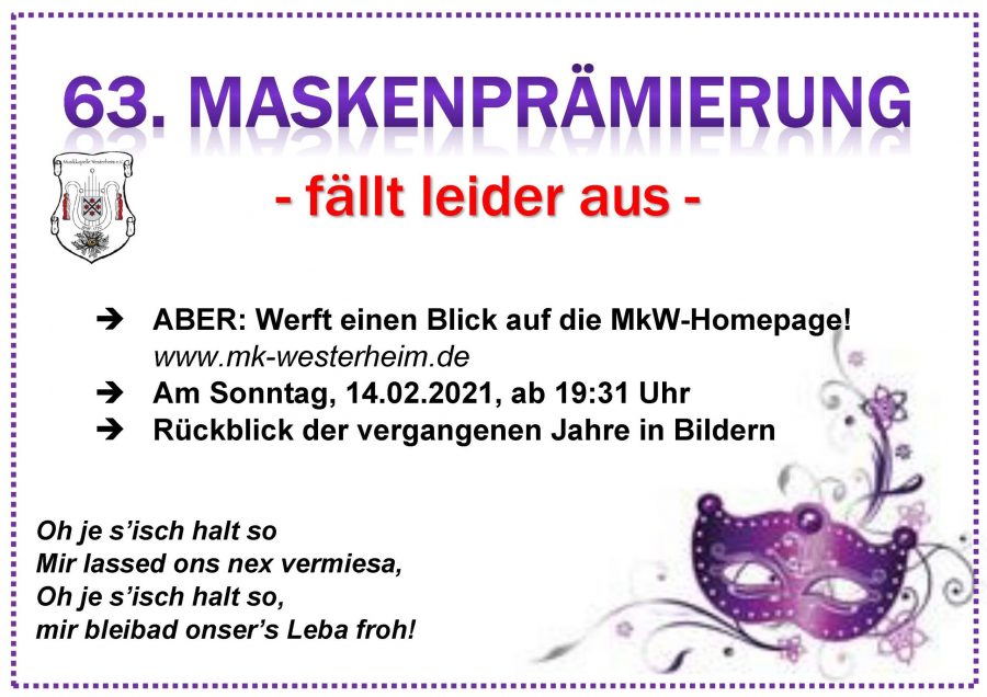 Auch in diesem Jahr freuen wir uns auf unsere Traditionsveranstaltung, die Maskenpämierung. Hierzu laden wir Sie recht herzlich ein. Unsere Maskenprämierung findet am 02.03.2025 ab 18:29 in der Albhalle statt. Tickets gibt es am Samstag, 15.01.2025 von 10:00 – 12:00 Uhr im Musikerheim für 10€ zu kaufen.. Wir freuen uns auf euch!!! Maske…